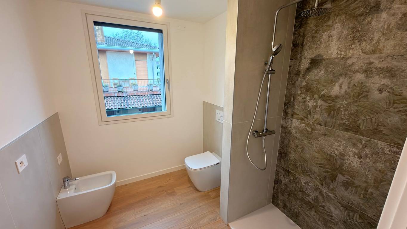 Vendesi porzione di trifamiliare di nuova costruzione, disposta su due livelli, e composta da ingresso, ampia e luminosa zona giorno open space, cucina defilata con angolo cottura, 3 camere, 3 bagni, lavanderia, terrazza nella camera padronale e giardino privato con una grande pompeiana.